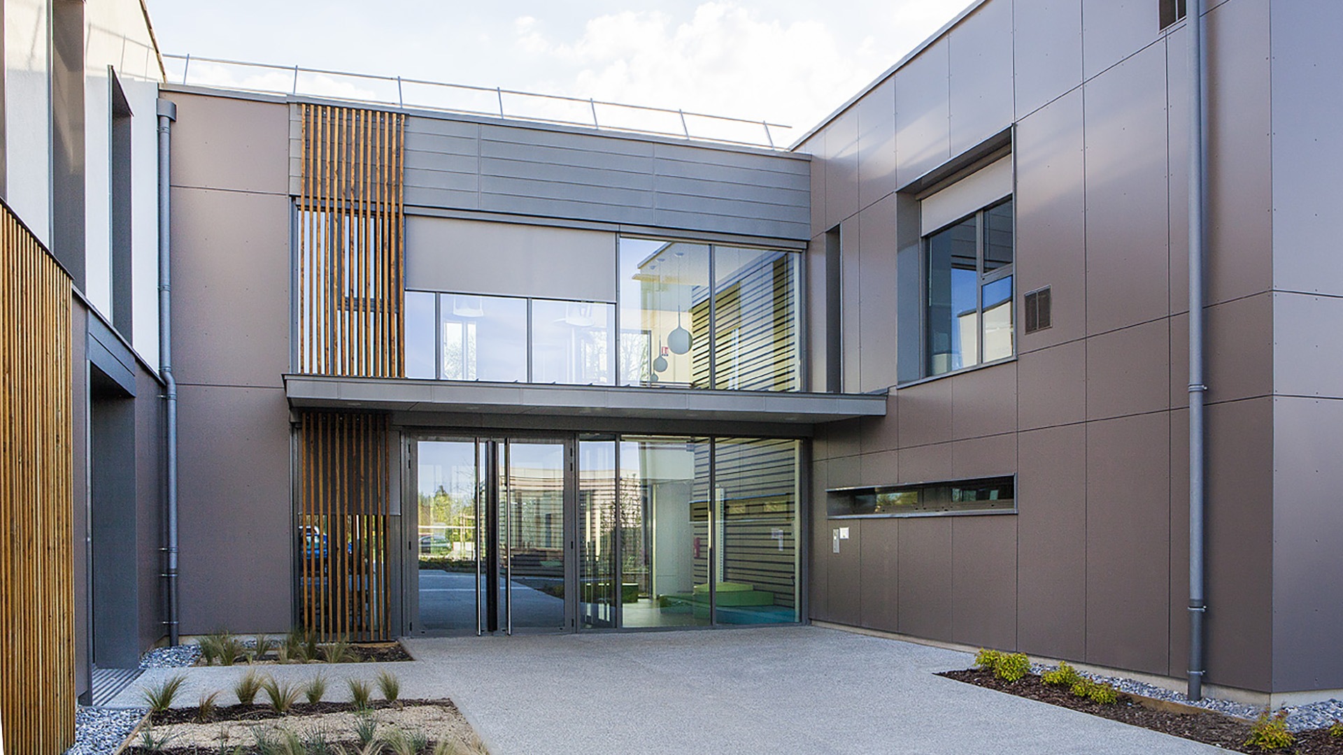 L’entrée de l’Institut Médico-Educatif est très largement vitrée, en double hauteur, afin de lui donner plus de transparence et créer une faille visuelle sur le patio. Elle sépare les unités de vie des espaces d’accueil de jour et de soin. Les quatre unités de vies sont regroupées en deux volumes distincts. Leur position, en fond de parcelle, proche de la lisière d’arbres, leur apporte l’isolement nécessaire par rapport aux bruits de la rue et une ambiance plus résidentielle, en lien avec la nature.