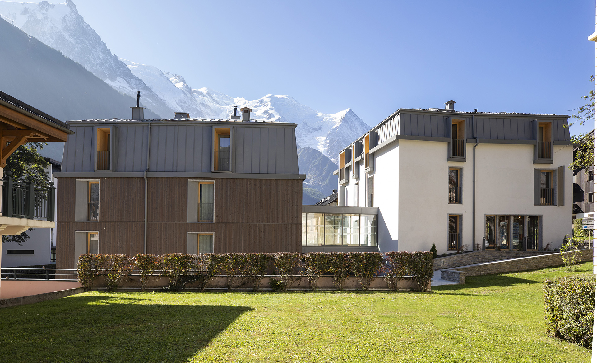 Travailler à Chamonix, pour un architecte, c’est d’abord s’inscrire dans la verticalité d’un paysage saisissant. C’est aussi intervenir dans un contexte chargé d’Histoire. L’Hélium reprend les codes des vieux hôtels du centre de Chamonix : compacité de formes, verticalité des baies ouvertes vers les sommets, granit des encadrements, toitures mansardées… dans une écriture rajeunie qui compose avec deux volumes inscrits dans la pente du terrain : l’un minéral, l’autre en bois afin de dialoguer aussi avec la forte présence des chalets traditionnels du secteur.