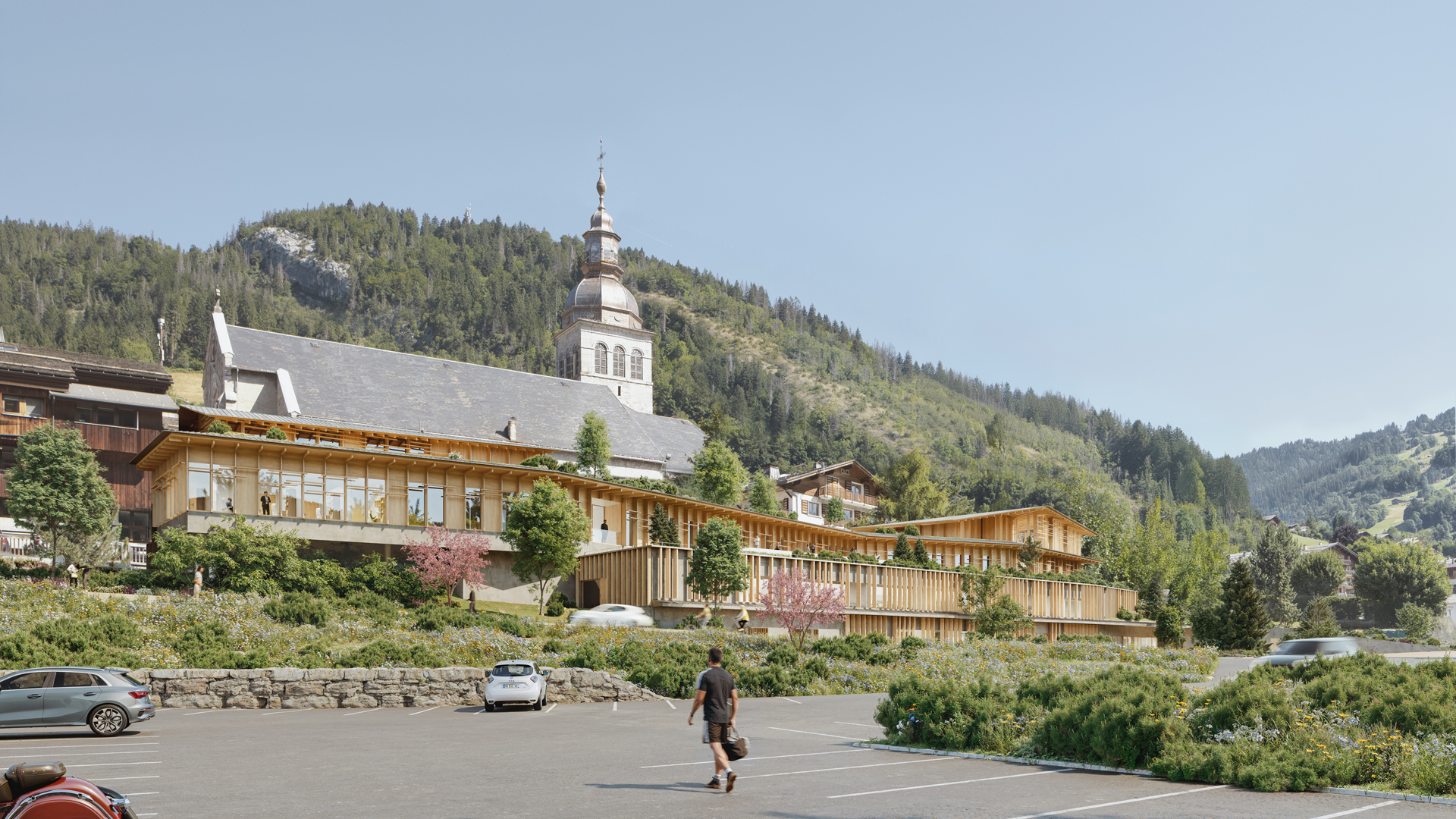 Implanté en lanière étroite entre l’église et le pôle d’échanges multimodal, le bâtiment multiservices suit avec justesse la pente naturelle. Depuis le haut, il apparaît comme un balcon suspendu sur la vallée du Borne ; depuis le bas, il se déploie en gradins dans le terrain, en dialogue avec le relief et la lumière. Son architecture, sobre et ancrée, privilégie les lignes horizontales, les matériaux locaux (bois, pierre, végétal) et des façades filtrantes en lames bois qui évoquent les rythmes des chalets et séchoirs d’alpage. Le projet s’intègre avec douceur dans le paysage tout en affirmant un rôle central et fédérateur au sein du village.