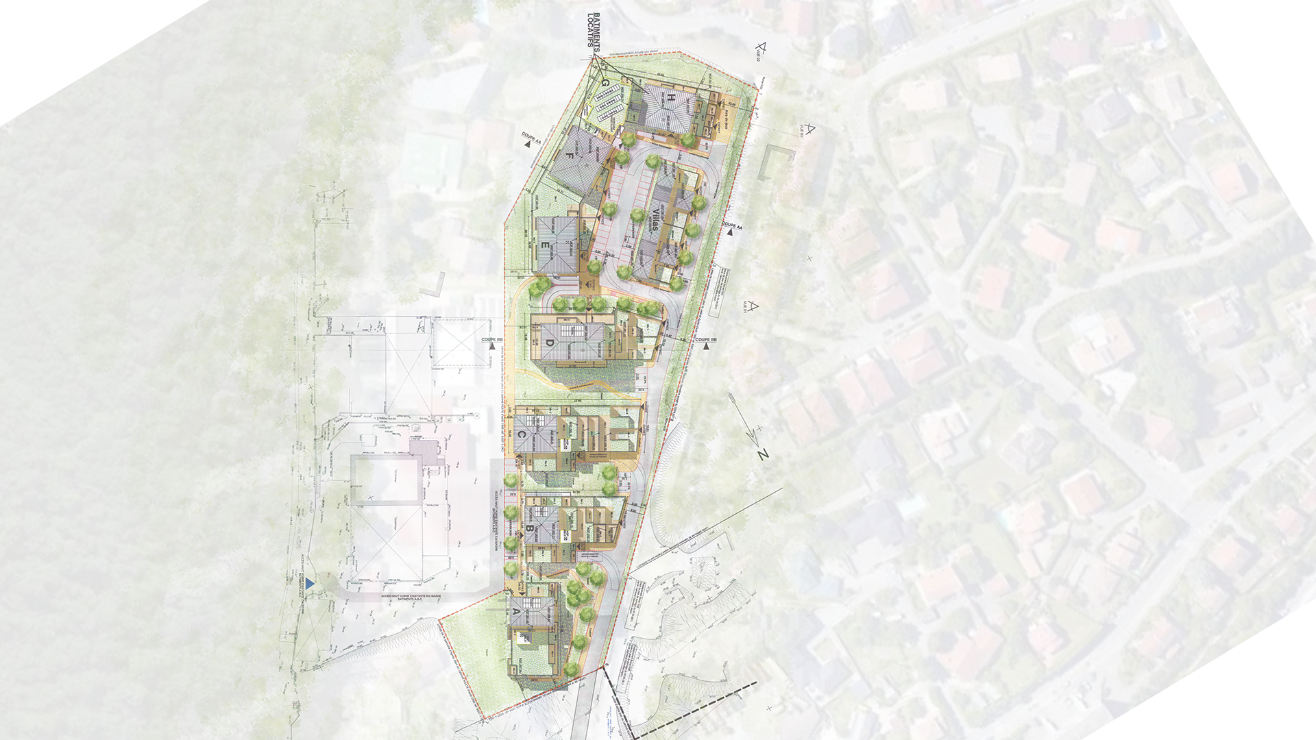 – Un second composé de quatre bâtiments (M, N, O, P) et de garages en superstructure adossés à un talus mitoyen existant qui servira à les conforter, situés sur le plateau dominant l’ensemble du foncier de ces deux phases.