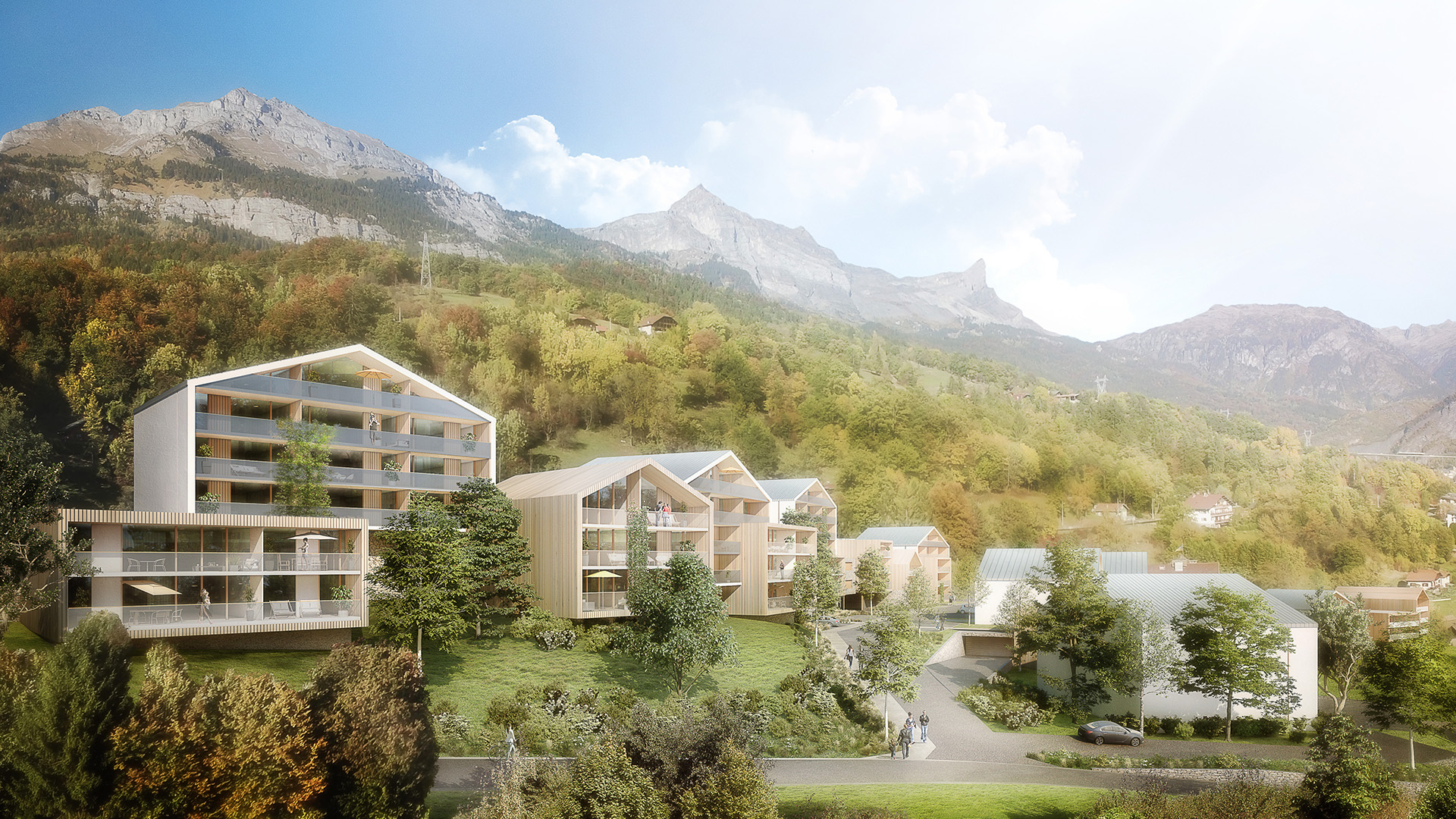 de plain-pied, sont utilisés en socles et soubassements semi enterrés qui portent et suspendent les bâtiments d’habitation. Deux typologies bâties sont proposées : Des volumes traditionnels d’habitation collective, composés de 4 ou 5 niveaux couverts par une grande toiture symétrique à deux pans. Ils sont desservis par ascenseur et offrent des typologies classiques. Ces volumes se répètent comme un leitmotiv de composition sur chacune des strates du projet.